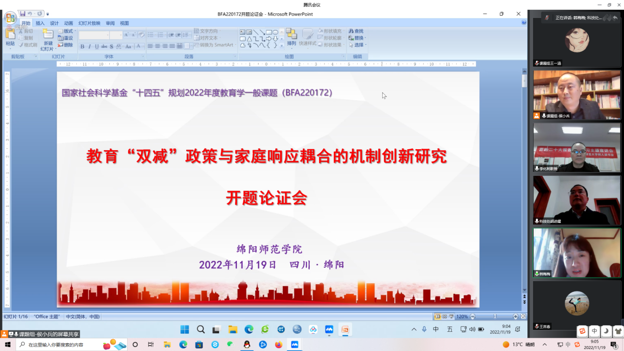 2022年11月19日上午,由绵阳师范学院侯小兵博士主持的国家社科基金“十四五”规划教育学一般项目《教育“双减”政策与家庭响应耦合的机制创新研究》(课题批准号:BFA220172)通过腾讯会议举行开题论证会。中国教育经济学会副理事长、西南大学教育学部博士生导师张学敏教授、四川省教育科学研究院科研所所长王真东研究员、四川师范大学吴定初教授、西华师范大学李化树教授、西南民族大学谭小宏教授、成都大学代显华教授和绵阳师范学院张天明教授担任评议专家。绵阳师范学院科技处处长胡进耀教授出席并致辞,科技处副处长韩黎教授主持,课题组全体成员参加了会议。